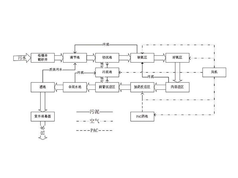 針對污水水質的特點,采用常規的“A2O生物接觸氧化·紫外線消毒”工藝,該處理工藝較為簡單,操作運行方便,日常費用低廉,出水穩定,處理效果好,是目前較為成熟的生活污水處理工藝,能有效地確保污水達標回用或排放。主要設備為鋼結構,考慮到周邊環境和衛生問題,污水處理工程科采用全埋地式結構,上部覆土,種植花木、草坪,進一步每戶環境。